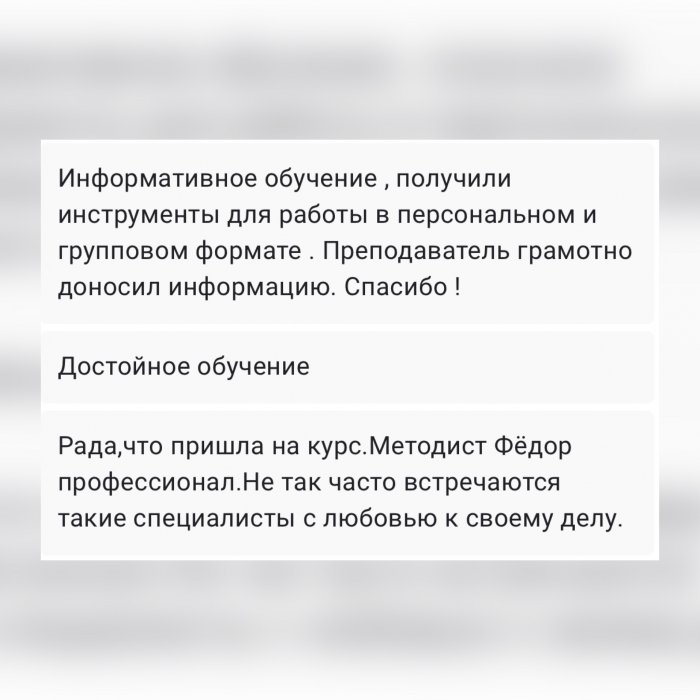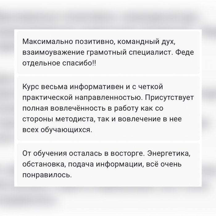 Сопровождение от преподавателя: обратная связь и онлайн-поддержка, домашние задания с обратной связью, доступ к видео, статьям, литературе и рекомендациям от специалистов смежных направлений.