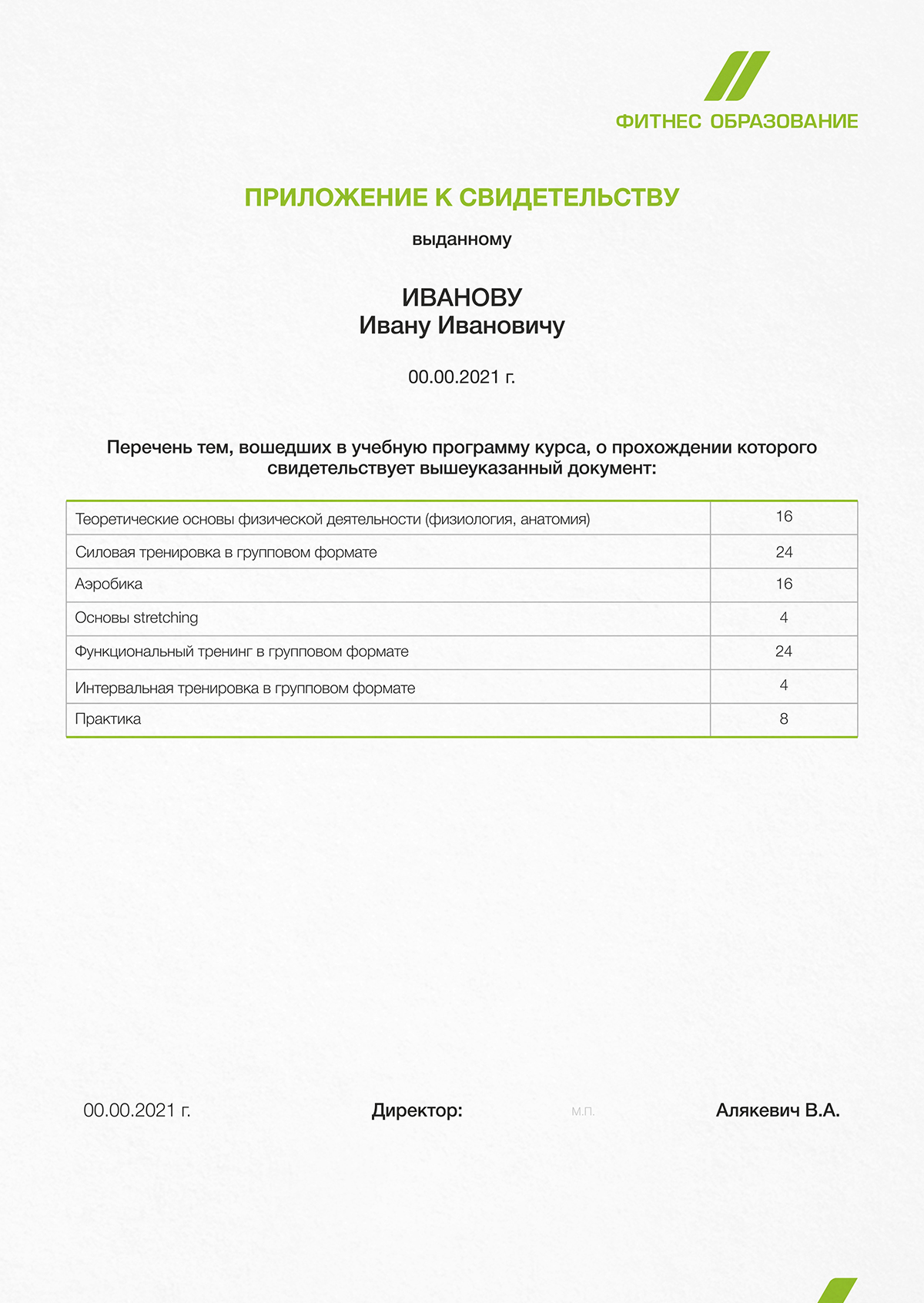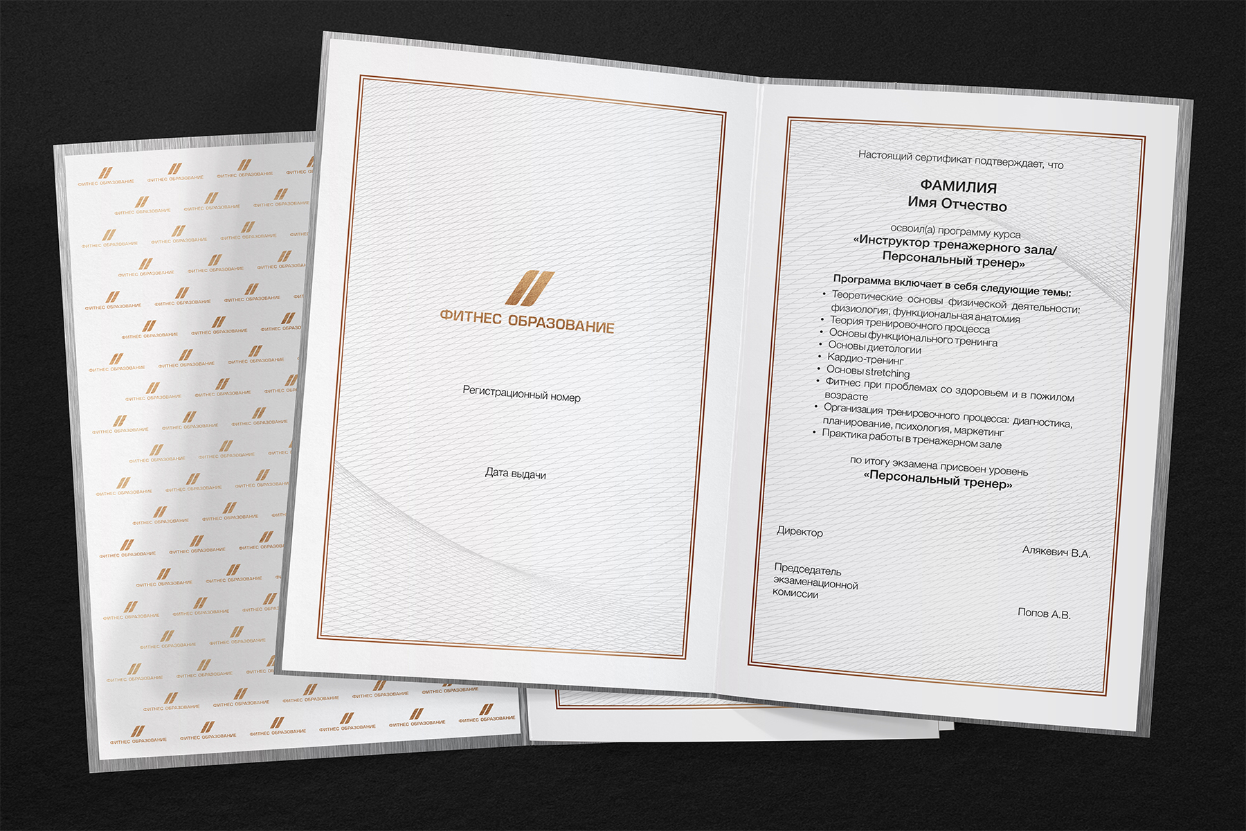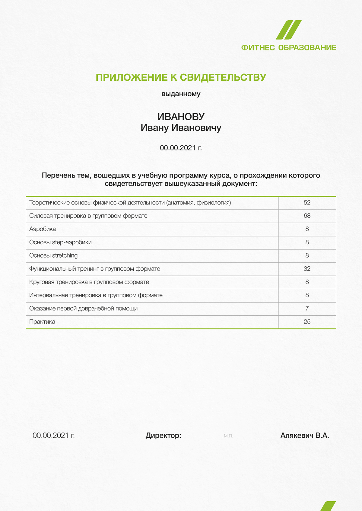 Помимо документа на государственном языке, мы можем дополнительно выдать сертификат или свидетельство на английском языке, заверенный печатью Учебного центра «Фитнес-образование». Такой документ содержит данные идентичные документу на государственном языке: название учебной программы, дата и номер документа, присвоенная квалификация, подпись руководителя, печать юридического лица.