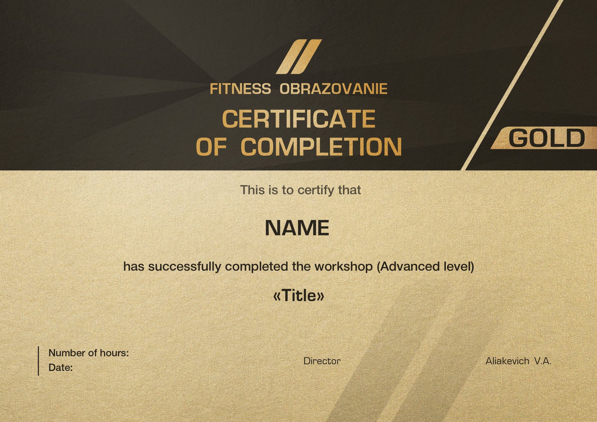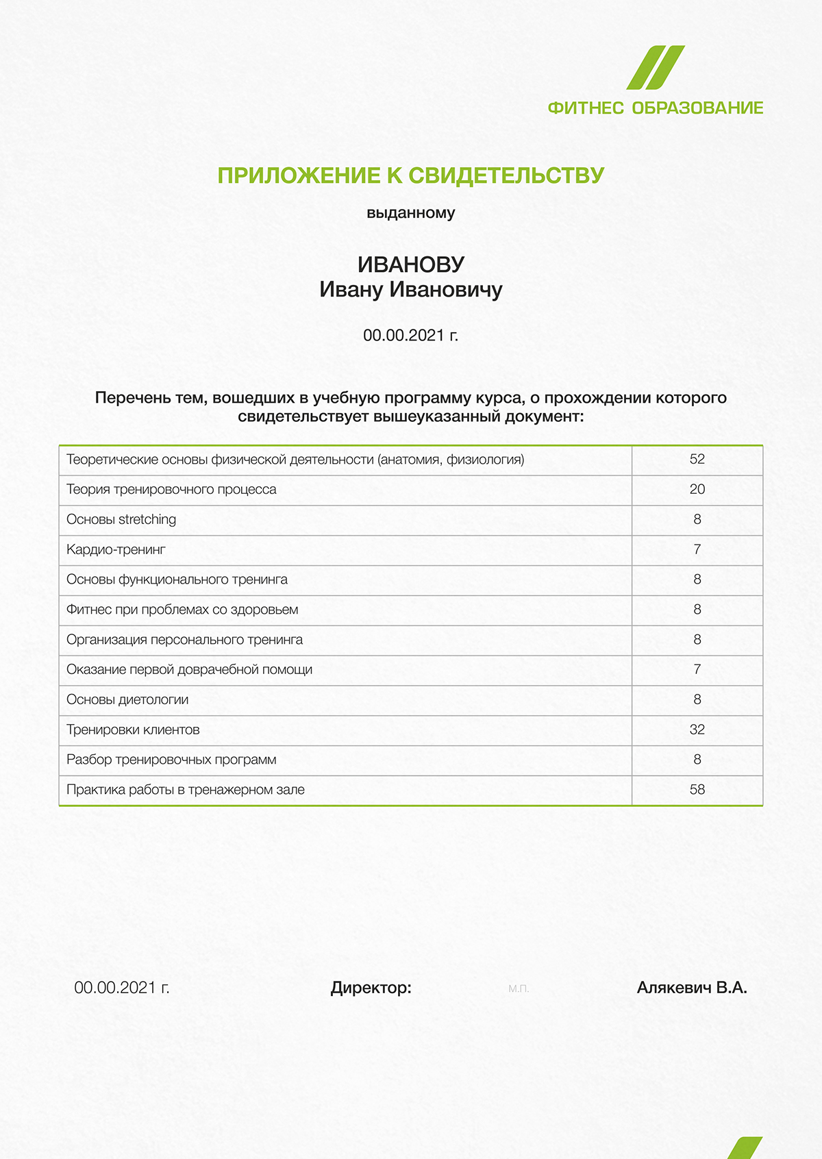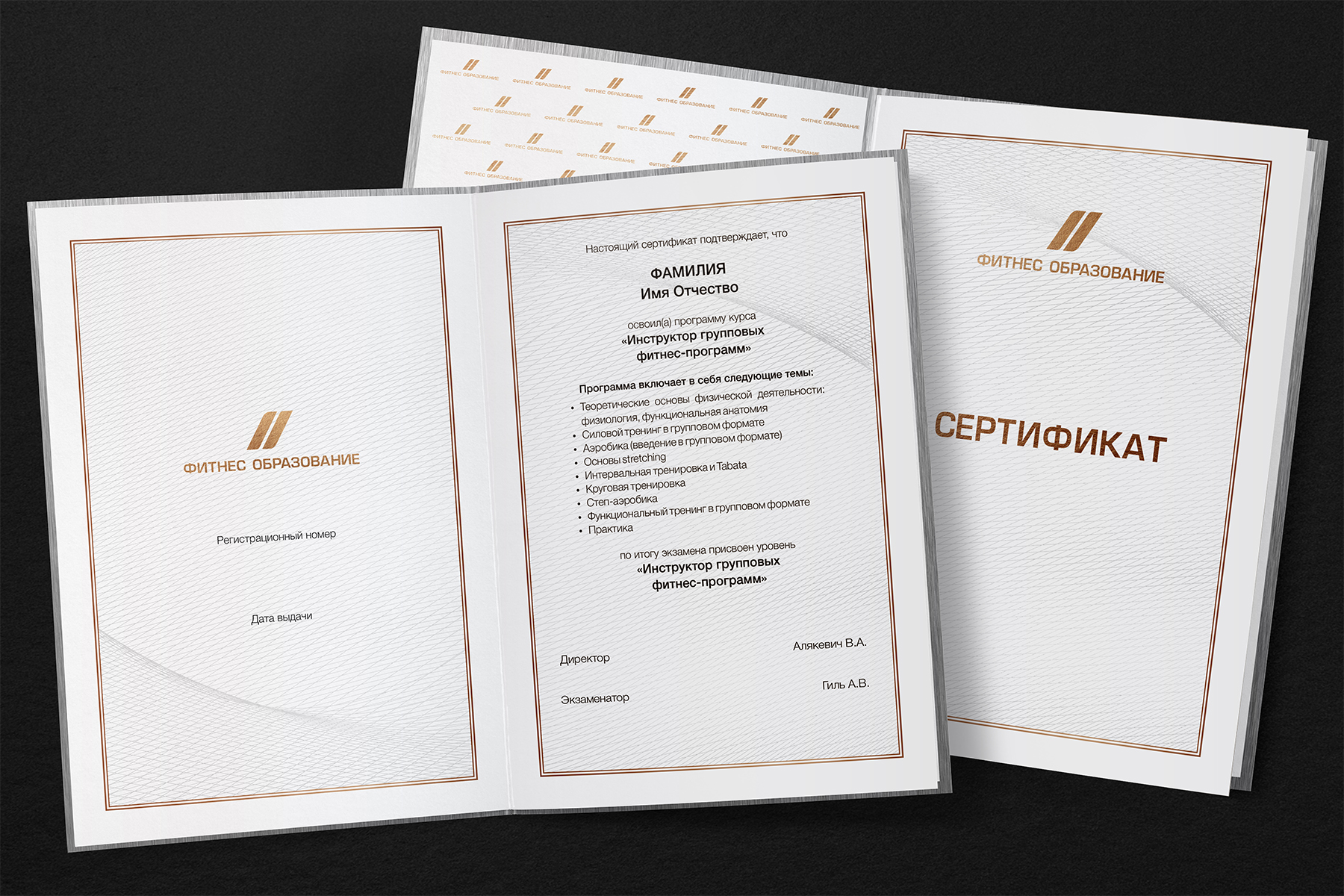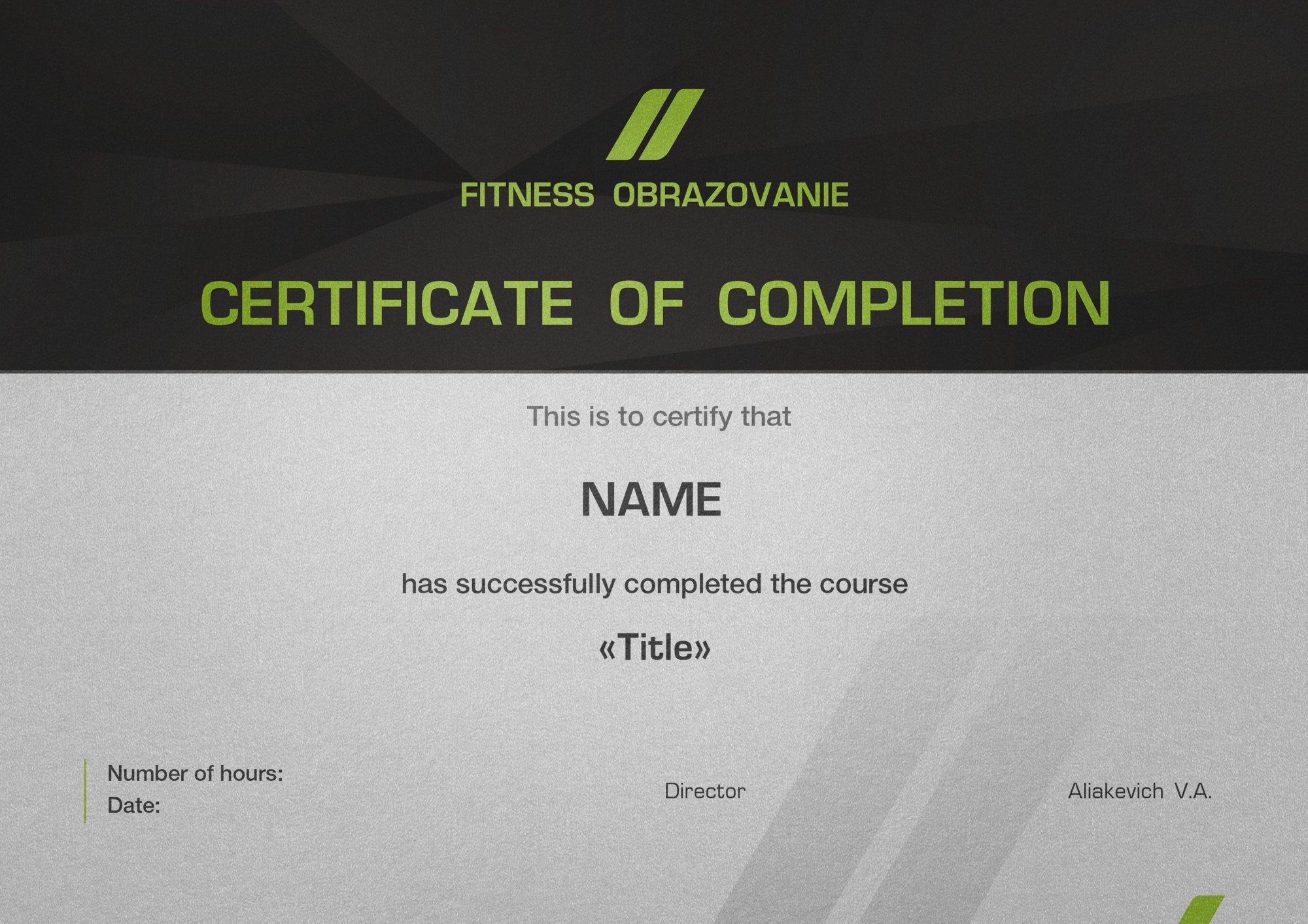 Помимо документа на государственном языке, мы можем дополнительно выдать сертификат или свидетельство на английском языке, заверенный печатью Учебного центра «Фитнес-образование». Такой документ содержит данные идентичные документу на государственном языке: название учебной программы, дата и номер документа, присвоенная квалификация, подпись руководителя, печать юридического лица.