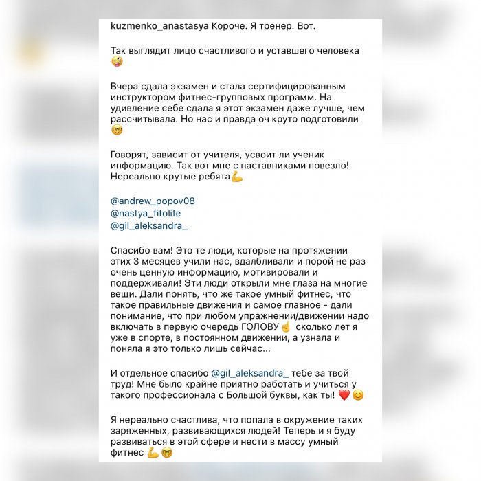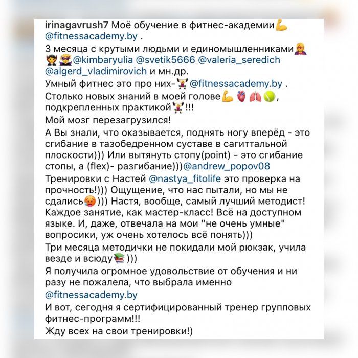 Мы ориентированы на то, чтобы вы действительно научились, а не просто прошли обучение. Каждый обучающийся пробует себя в роли инструктора во время практических занятий по перечисленным выше фитнес-направлениям.