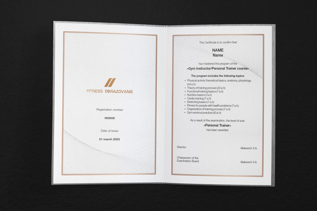- Сертификат инструктора тренажерного зала (базовый уровень) или персонального тренера (более высокий уровень) – в случае успешной сдачи экзамена.