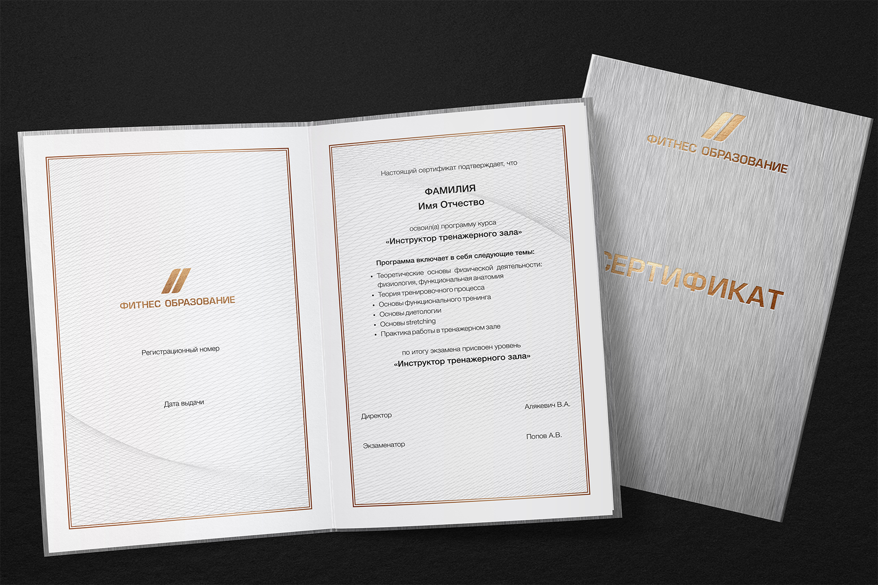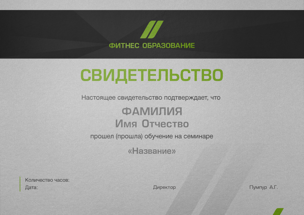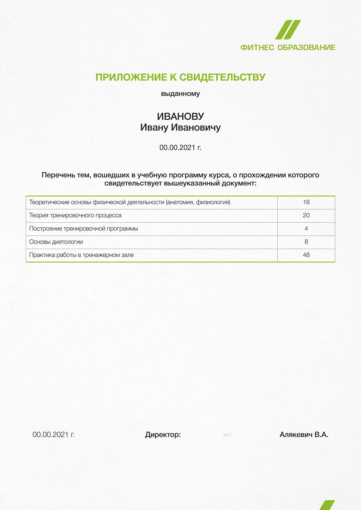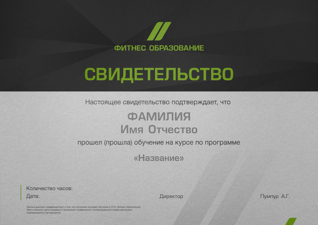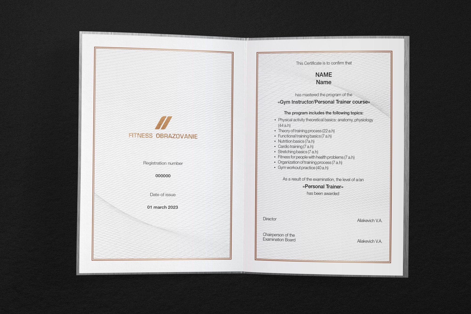 Помимо документа на государственном языке, мы можем дополнительно выдать сертификат или свидетельство на английском языке, заверенный печатью Учебного центра «Фитнес-образование». Такой документ содержит данные идентичные документу на государственном языке: название учебной программы, дата и номер документа, присвоенная квалификация, подпись руководителя, печать юридического лица.